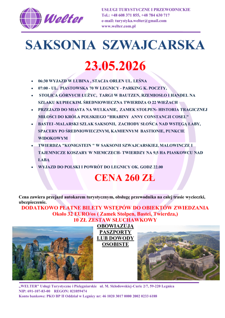 23.05.2026 SAKSONIA SZWAJCARSKA 1 Dzień Koszty Koszty CENA OBEJMUJEPRZEJAZD AUTOKAREMUBEZPIECZENIEOBSŁUGĘ PRZEWODNIKA CENA NIE OBEJMUJEDODATKOWO PŁATNE BILETY WSTĘPÓWOK 32 EURO/OS ( ZAMEK STOLPEN, BASTEI TWIERDZA)10 ZŁ/ OS. ZESTAW SŁUCHAWKOWY Planowany termin wpłaty Typ pakietu Cofnij Dalej Rezerwację możesz dokonać poprzez poniższy formularz. Nazwa wycieczki: * 23.05.2026 SAKSONIA SZWAJCARSKA Twoje imię: * Twój e-mail: * Kraj * Wybierz kraj AfghanistanÅland IslandsAlbaniaAlgeriaAmerican SamoaAndorraAngolaAnguillaAntarcticaAntigua and BarbudaArgentinaArmeniaArubaAustraliaAustriaAzerbaijanBahamasBahrainBangladeshBarbadosBelarusBelgiumBelauBelizeBeninBermudaBhutanBoliviaBonaire, Saint Eustatius and SabaBosnia and HerzegovinaBotswanaBouvet IslandBrazilBritish Indian Ocean TerritoryBruneiBulgariaBurkina FasoBurundiCambodiaCameroonCanadaCape VerdeCayman IslandsCentral African RepublicChadChileChinaChristmas IslandCocos (Keeling) IslandsColombiaComorosCongo (Brazzaville)Congo (Kinshasa)Cook IslandsCosta RicaCroatiaCubaCuraçaoCyprusCzech RepublicDenmarkDjiboutiDominicaDominican RepublicEcuadorEgyptEl SalvadorEquatorial GuineaEritreaEstoniaEthiopiaFalkland IslandsFaroe IslandsFijiFinlandFranceFrench GuianaFrench PolynesiaFrench Southern TerritoriesGabonGambiaGeorgiaGermanyGhanaGibraltarGreeceGreenlandGrenadaGuadeloupeGuamGuatemalaGuernseyGuineaGuinea-BissauGuyanaHaitiHeard Island and McDonald IslandsHondurasHong KongHungaryIcelandIndiaIndonesiaIranIraqIrelandIsle of ManIsraelItalyIvory CoastJamaicaJapanJerseyJordanKazakhstanKenyaKiribatiKuwaitKyrgyzstanLaosLatviaLebanonLesothoLiberiaLibyaLiechtensteinLithuaniaLuxembourgMacaoNorth MacedoniaMadagascarMalawiMalaysiaMaldivesMaliMaltaMarshall IslandsMartiniqueMauritaniaMauritiusMayotteMexicoMicronesiaMoldovaMonacoMongoliaMontenegroMontserratMoroccoMozambiqueMyanmarNamibiaNauruNepalNetherlandsNew CaledoniaNew ZealandNicaraguaNigerNigeriaNiueNorfolk IslandNorthern Mariana IslandsNorth KoreaNorwayOmanPakistanPalestinian TerritoryPanamaPapua New GuineaParaguayPeruPhilippinesPitcairnPolandPortugalPuerto RicoQatarReunionRomaniaRussiaRwandaSaint BarthélemySaint HelenaSaint Kitts and NevisSaint LuciaSaint Martin (French part)Saint Martin (Dutch part)Saint Pierre and MiquelonSaint Vincent and the GrenadinesSan MarinoSão Tomé and PríncipeSaudi ArabiaSenegalSerbiaSeychellesSierra LeoneSingaporeSlovakiaSloveniaSolomon IslandsSomaliaSouth AfricaSouth Georgia/Sandwich IslandsSouth KoreaSouth SudanSpainSri LankaSudanSurinameSvalbard and Jan MayenSwazilandSwedenSwitzerlandSyriaTaiwanTajikistanTanzaniaThailandTimor-LesteTogoTokelauTongaTrinidad and TobagoTunisiaTurkeyTurkmenistanTurks and Caicos IslandsTuvaluUgandaUkraineUnited Arab EmiratesUnited Kingdom (UK)United States (US)United States (US) Minor Outlying IslandsUruguayUzbekistanVanuatuVaticanVenezuelaVietnamVirgin Islands (British)Virgin Islands (US)Wallis and FutunaWestern SaharaSamoaYemenZambiaZimbabwe Telefon kontaktowy: * Liczba dorosłych * Liczba Dzieci Temat zapytania: * Treść wiadomości * Wyślij Pokaż ceny Od 260zł / Dorośli Zarezerwuj